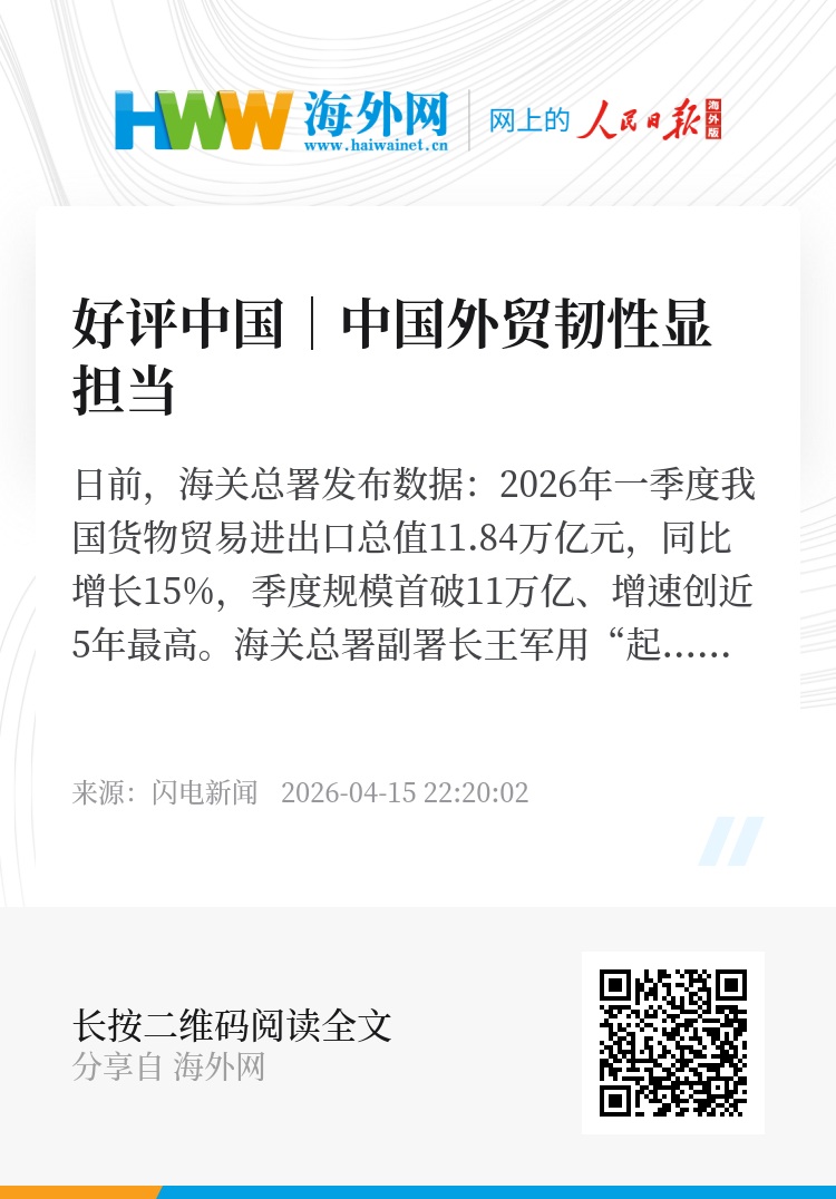日前,海关总署发布数据:2026年一季度我国货物贸易进出口总值11.84万亿元,同比增长15%,季度规模首破11万亿、增速创近5年最高。海关总署副署长王军用“起势有力、开局良好”八个字,精准概括这份“十五五”开局首季答卷。在全球贸易增速放缓、外部环境复杂严峻的背景下,中国外贸跑出“加速度”,绝非偶然,而是底盘稳、活力足、动能强三重优势叠加的必然结果,彰显了中国开放型经济的强大韧性与战略定力。