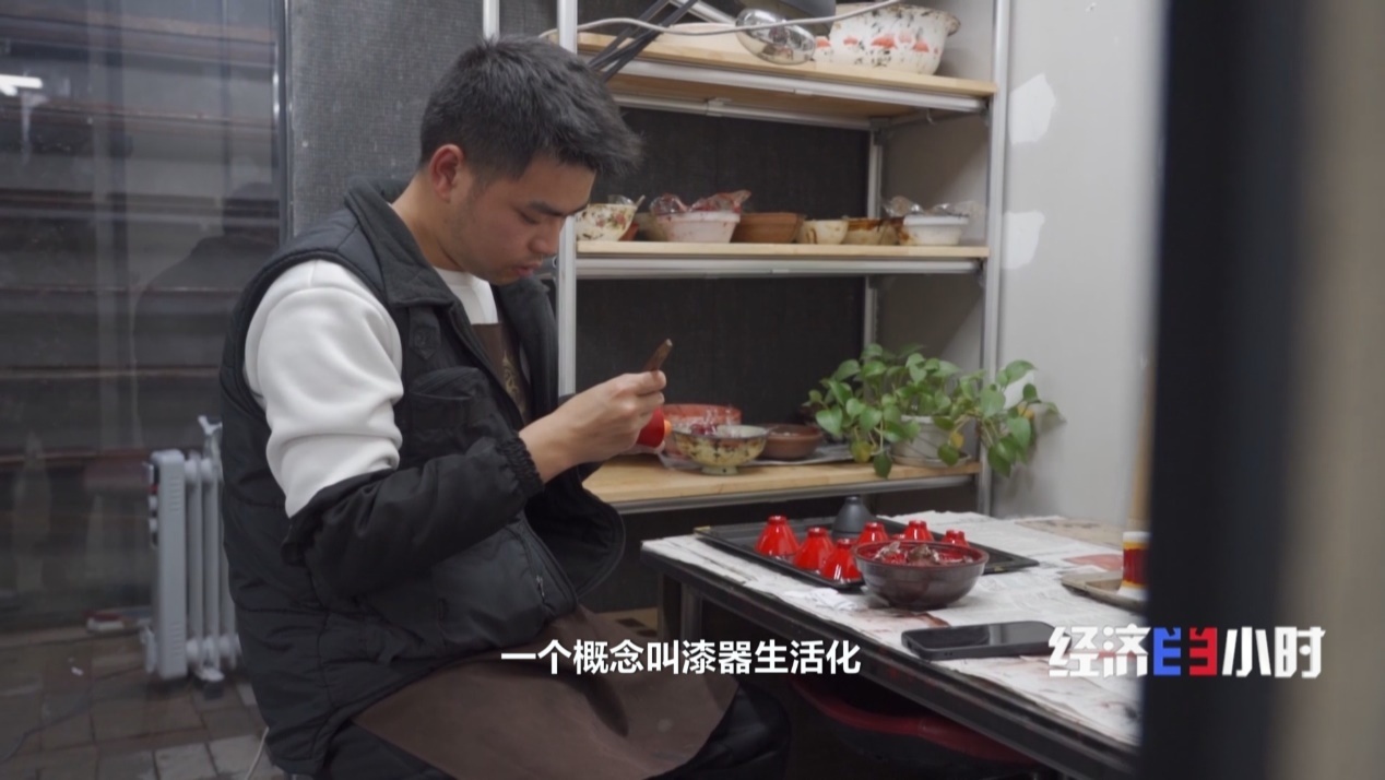这个开设在茶馆里的漆器文创店,独特之处在于采购体验于一体。漆器不再被锁进玻璃柜,而是被放置在茶桌旁、展示架上。消费者可以上手体验简单的打磨工序。