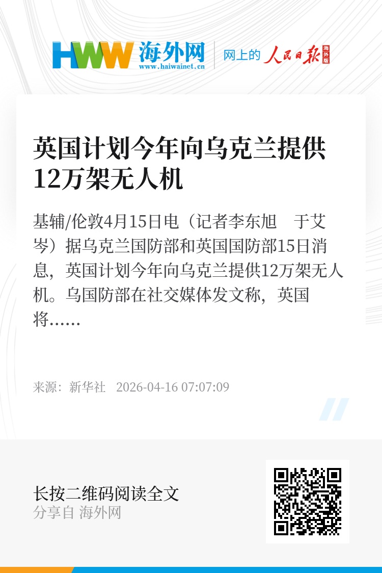 新华社基辅/伦敦4月15日电(记者李东旭 于艾岑)据乌克兰国防部和英国国防部15日消息,英国计划今年向乌克兰提供12万架无人机。