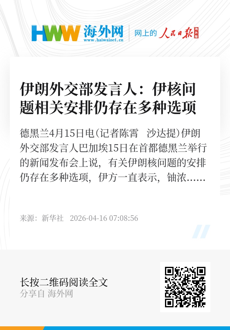 新华社德黑兰4月15日电(记者陈霄 沙达提)伊朗外交部发言人巴加埃15日在首都德黑兰举行的新闻发布会上说,有关伊朗核问题的安排仍存在多种选项,伊方一直表示,铀浓缩活动的类型和水平可以协商。