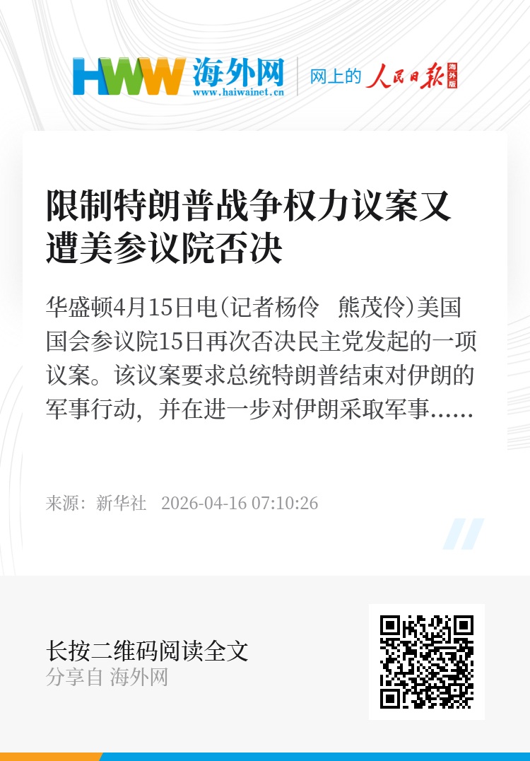 新华社华盛顿4月15日电(记者杨伶 熊茂伶)美国国会参议院15日再次否决民主党发起的一项议案。该议案要求总统特朗普结束对伊朗的军事行动,并在进一步对伊朗采取军事行动前必须获得国会授权。
