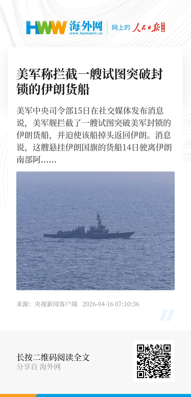 美军中央司令部15日在社交媒体发布消息说,美军舰拦截了一艘试图突破美军封锁的伊朗货船,并迫使该船掉头返回伊朗。