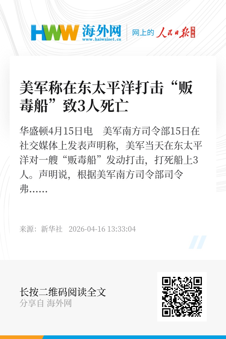 新华社华盛顿4月15日电 美军南方司令部15日在社交媒体上发表声明称,美军当天在东太平洋对一艘“贩毒船”发动打击,打死船上3人。