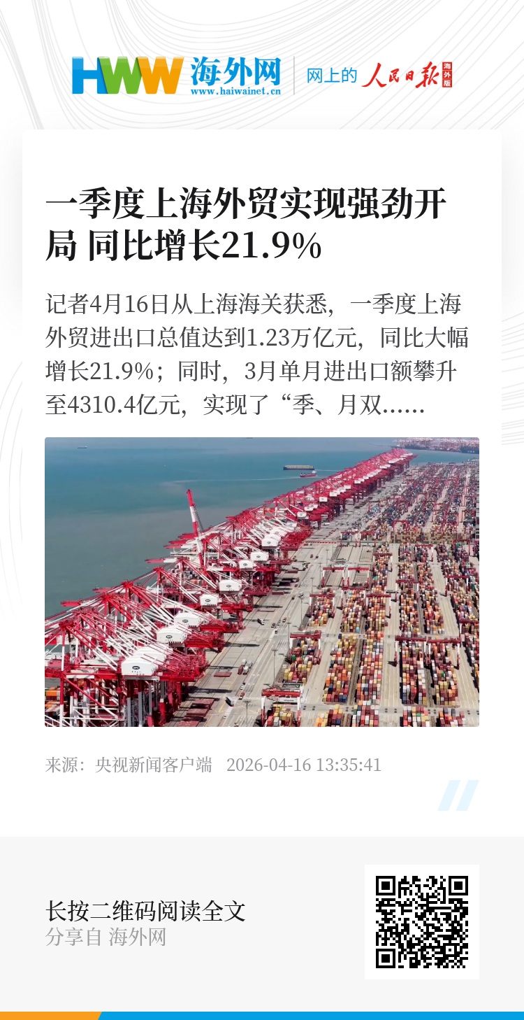 记者4月16日从上海海关获悉,一季度上海外贸进出口总值达到1.23万亿元,同比大幅增长21.9%;同时,3月单月进出口额攀升至4310.4亿元,实现了“季、月双创纪录”的强劲开局。