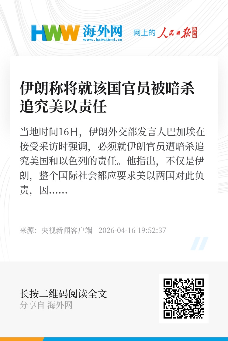 当地时间16日,伊朗外交部发言人巴加埃在接受采访时强调,必须就伊朗官员遭暗杀追究美国和以色列的责任。