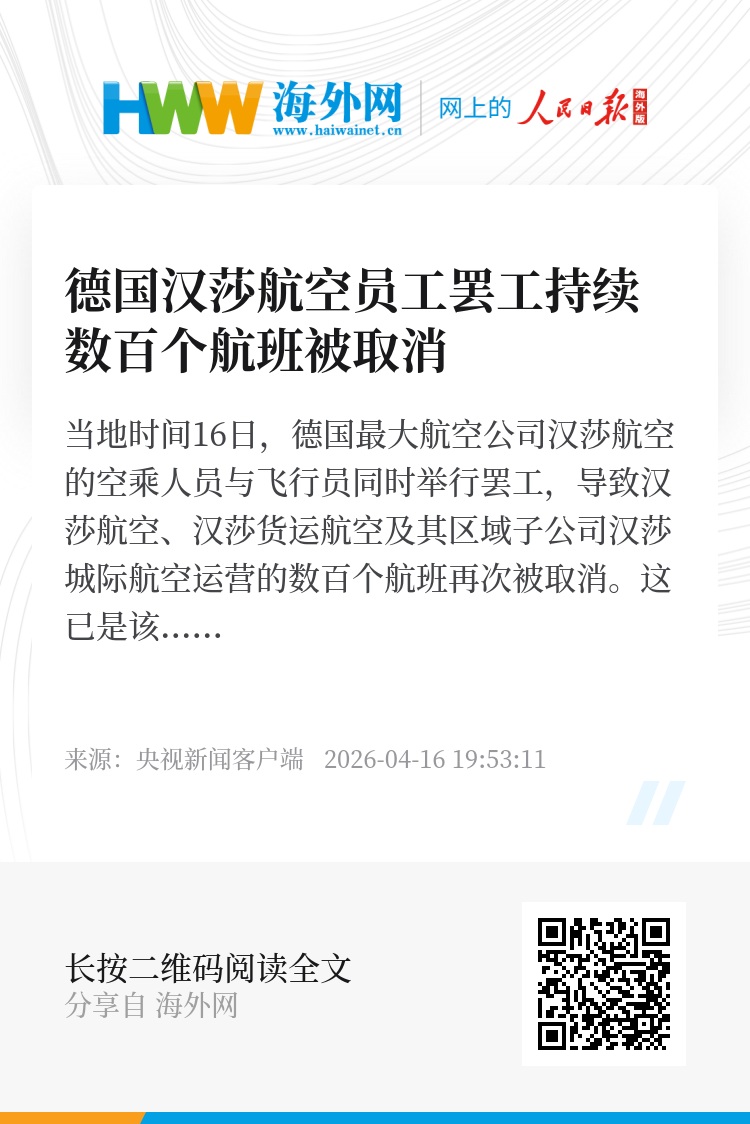 当地时间16日,德国最大航空公司汉莎航空的空乘人员与飞行员同时举行罢工,导致汉莎航空、汉莎货运航空及其区域子公司汉莎城际航空运营的数百个航班再次被取消。这已是该航空公司机组人员连续四天罢工。