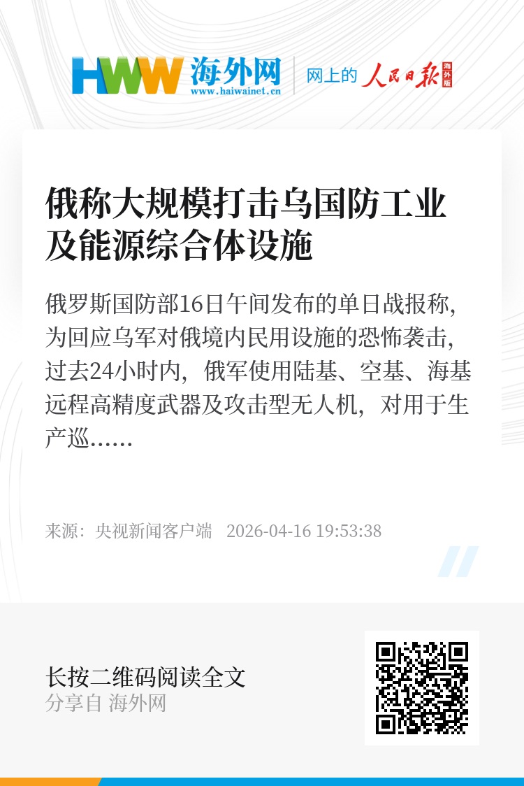 俄罗斯国防部16日午间发布的单日战报称,为回应乌军对俄境内民用设施的恐怖袭击,过去24小时内,俄军使用陆基、空基、海基远程高精度武器及攻击型无人机,对用于生产巡航导弹和中远程无人机的乌国防工业综合体设施以及服务于乌军的燃料能源综合体设施发动了大规模打击。