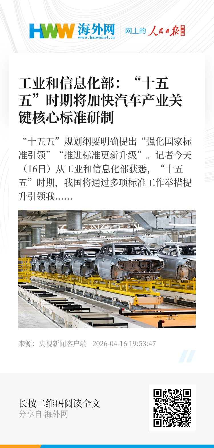 “十五五”规划纲要明确提出“强化国家标准引领”“推进标准更新升级”。记者今天(16日)从工业和信息化部获悉,“十五五”时期,我国将通过多项标准工作举措提升引领我国汽车产业高质量发展。
