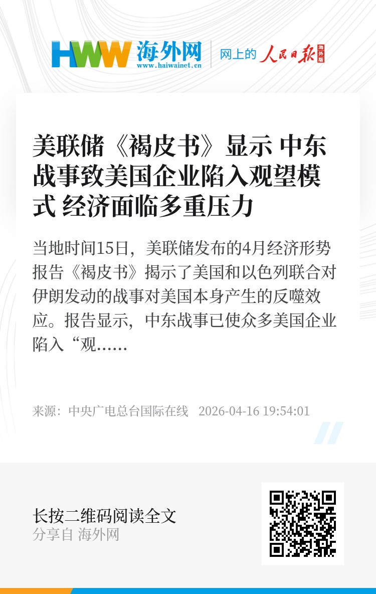 当地时间15日,美联储发布的4月经济形势报告《褐皮书》揭示了美国和以色列联合对伊朗发动的战事对美国本身产生的反噬效应。报告显示,中东战事已使众多美国企业陷入“观望”模式,能源和燃料成本的大幅攀升正不断挤压企业利润空间。