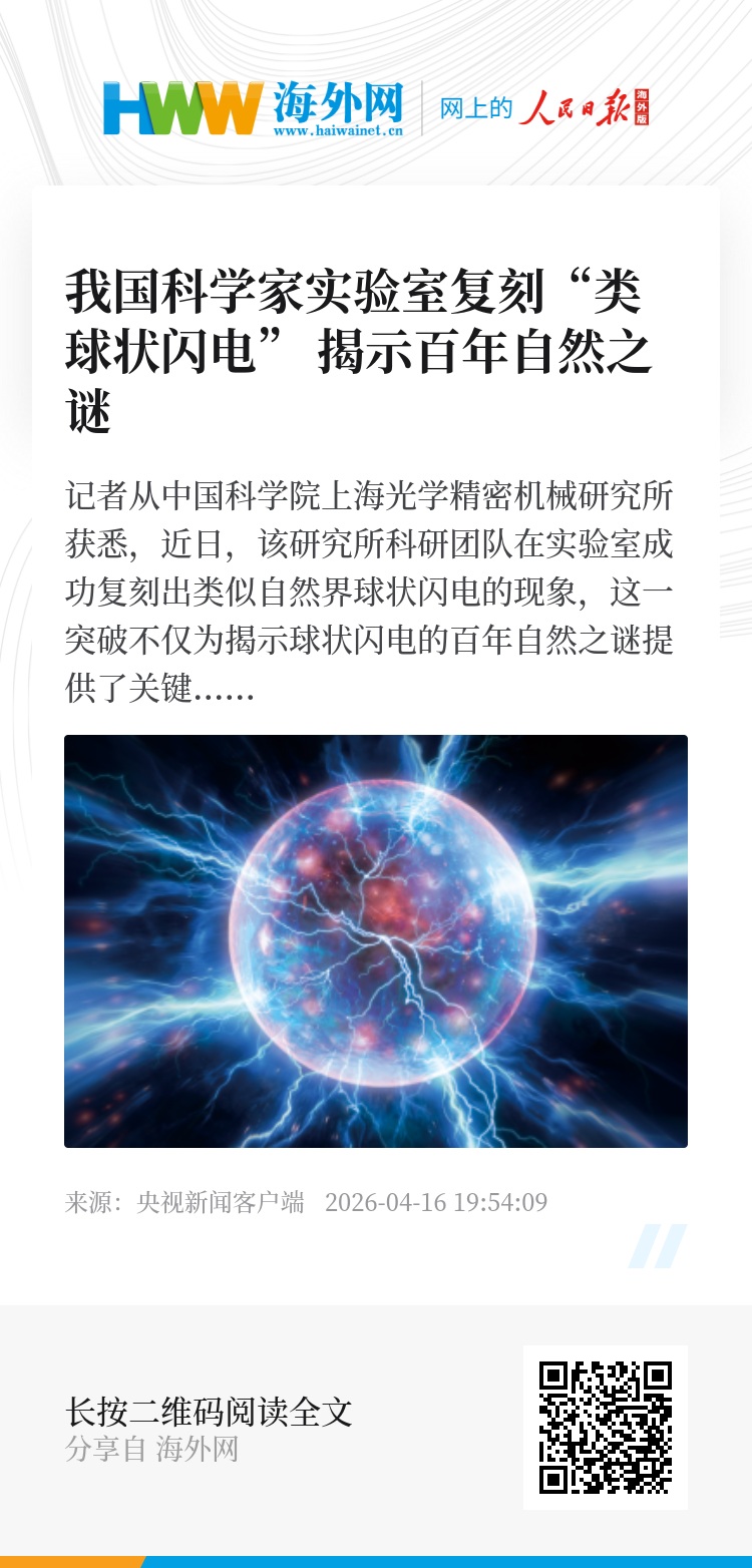 记者从中国科学院上海光学精密机械研究所获悉,近日,该研究所科研团队在实验室成功复刻出类似自然界球状闪电的现象,这一突破不仅为揭示球状闪电的百年自然之谜提供了关键实验证据,还阐明了极端条件下能量“自我约束”的物理机制。相关成果4月16日在国际学术期刊《自然・光子学》发表。