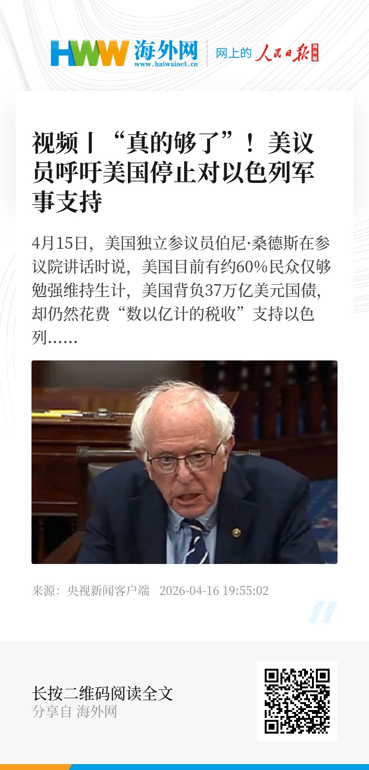 4月15日,美国独立参议员伯尼·桑德斯在参议院讲话时说,美国目前有约60%民众仅够勉强维持生计,美国背负37万亿美元国债,却仍然花费“数以亿计的税收”支持以色列政府的非法战争政策。