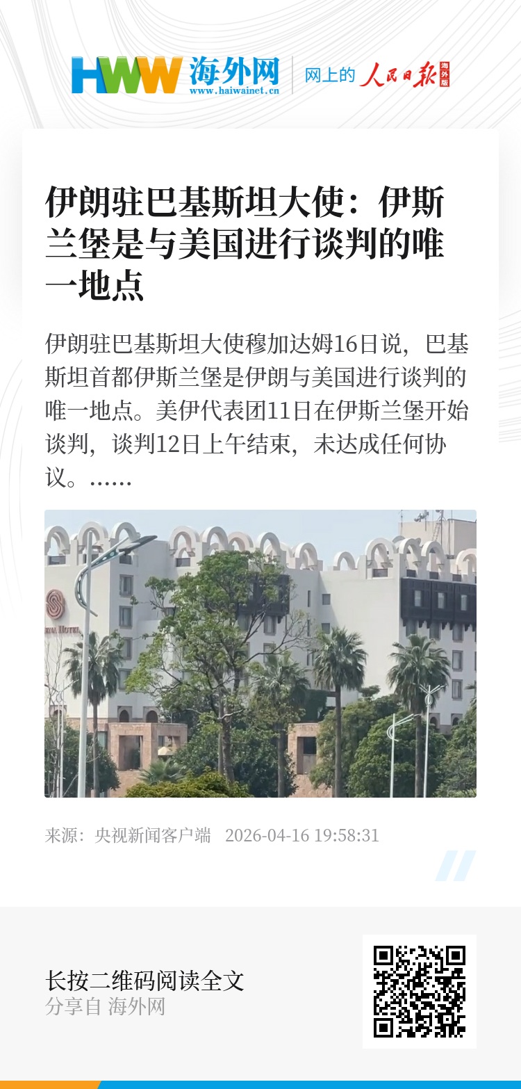伊朗驻巴基斯坦大使穆加达姆16日说,巴基斯坦首都伊斯兰堡是伊朗与美国进行谈判的唯一地点。