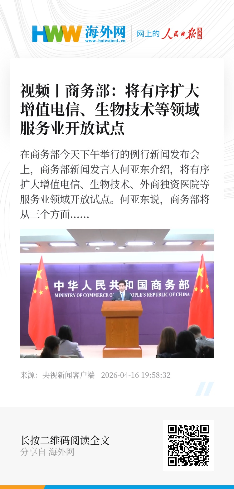 在商务部今天下午举行的例行新闻发布会上,商务部新闻发言人何亚东介绍,将有序扩大增值电信、生物技术、外商独资医院等服务业领域开放试点。