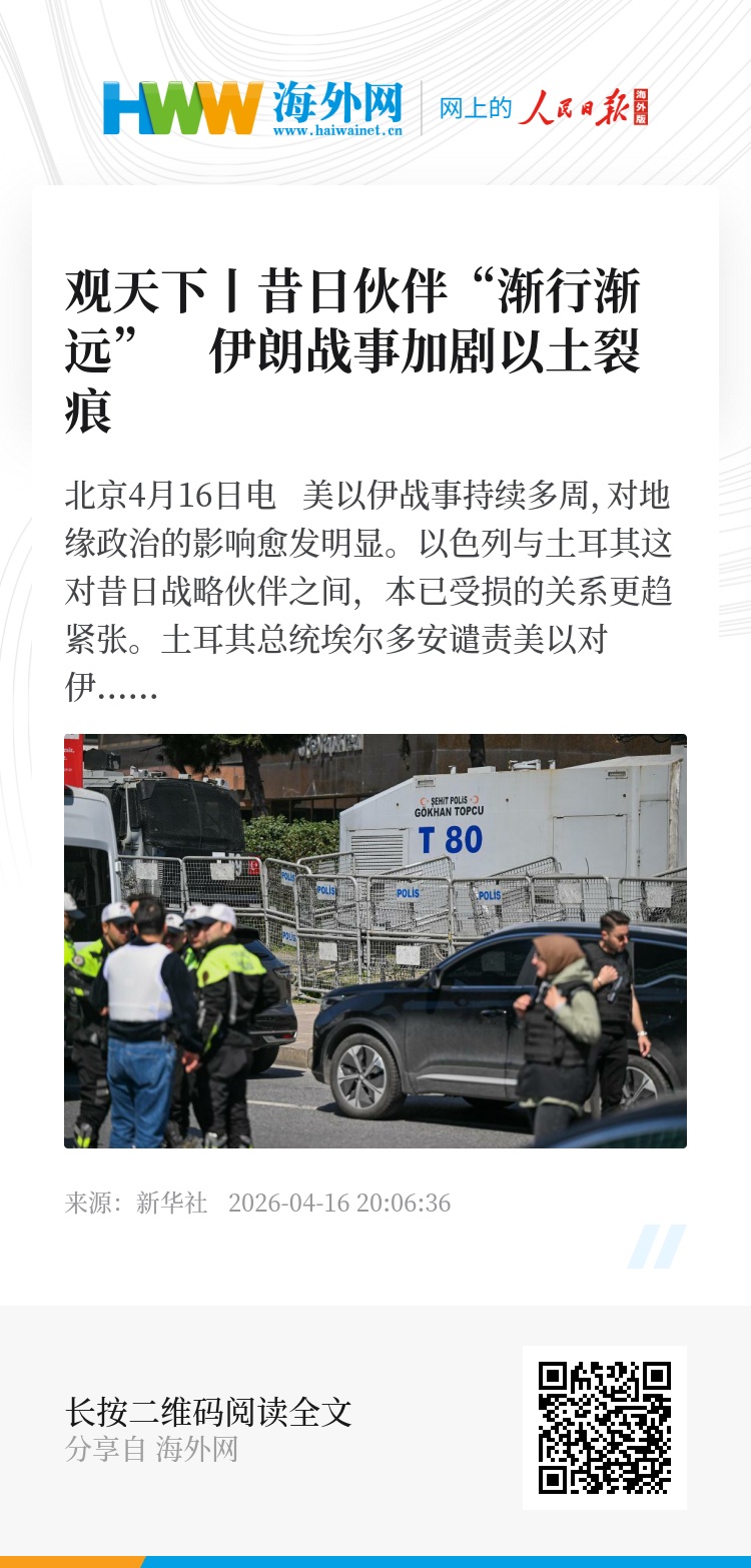 新华社北京4月16日电 美以伊战事持续多周,对地缘政治的影响愈发明显。以色列与土耳其这对昔日战略伙伴之间,本已受损的关系更趋紧张。土耳其总统埃尔多安谴责美以对伊朗的打击,以色列官员则批评土耳其的立场倾向于伊朗。《耶路撒冷邮报》15日援引分析人士的话报道,双方交锋升级令两国关系雪上加霜,短期内难以出现明显缓和。
