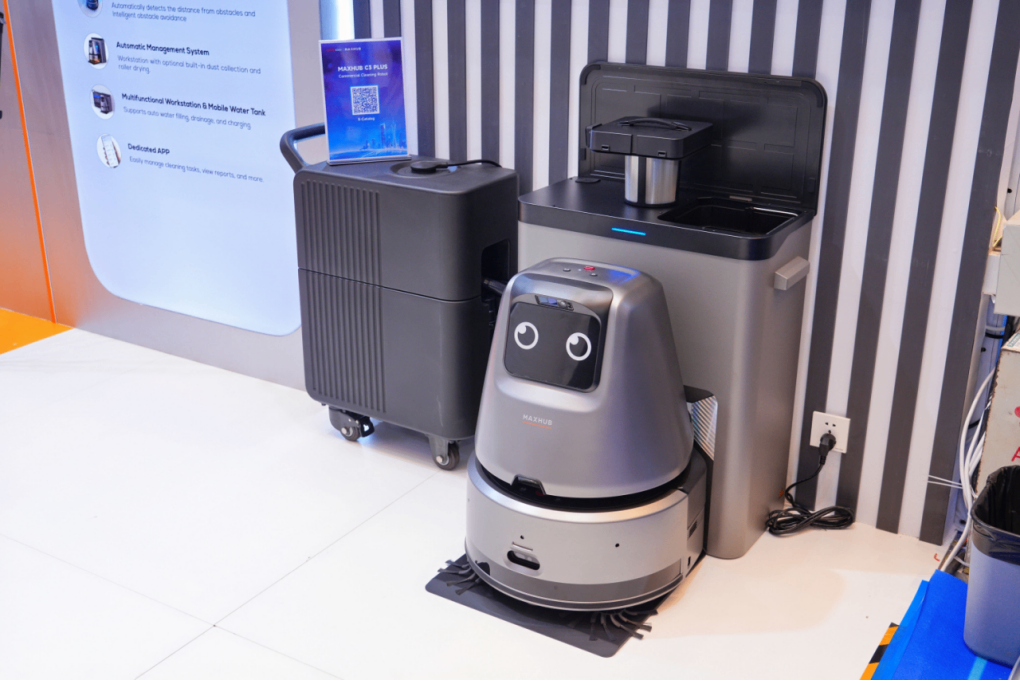 除四足机器人和机械臂外,视源股份还展出了MAXHUB C3 PLUS商用清洁机器人。该产品已与日本、韩国、新加坡及德国、英国、法国、意大利、荷兰、瑞典、波兰等欧洲国家客户达成合作,陆续实现落地部署。产品实现从吸尘到拖地的全流程自动化,单台设备覆盖500至3000平方米空间,配备AI智能探测器用于避障,并支持手机远程管理清洁任务。