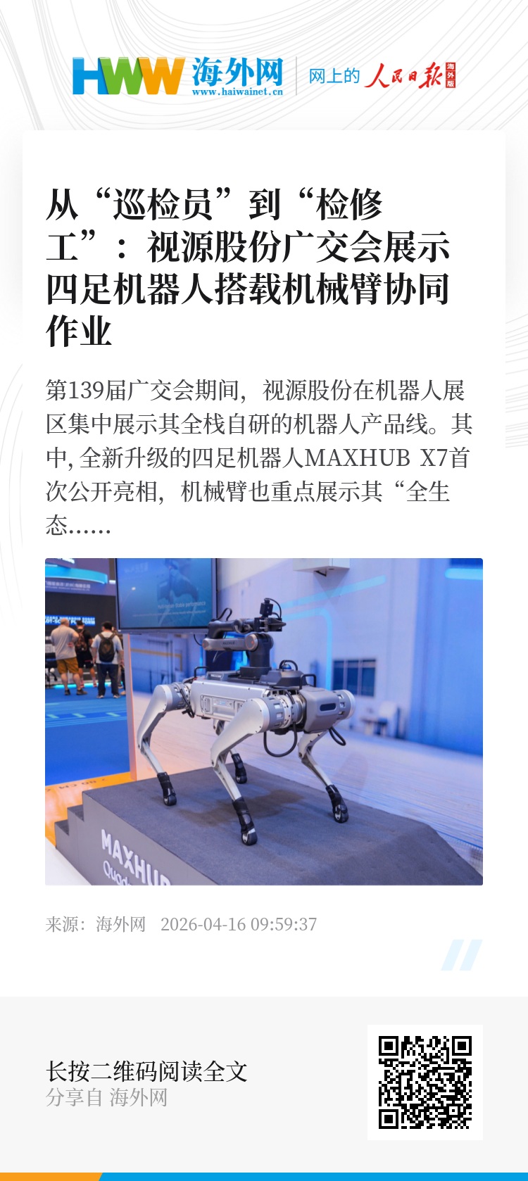 第139届广交会期间,视源股份在机器人展区集中展示其全栈自研的机器人产品线。其中,全新升级的四足机器人MAXHUB X7首次公开亮相,机械臂也重点展示其“全生态兼容”能力,机械臂+灵巧手、机械臂+机器狗、机械臂+OpenClaw等吸引大批中外客商关注。