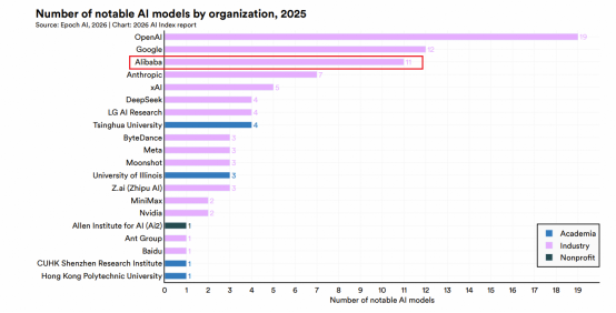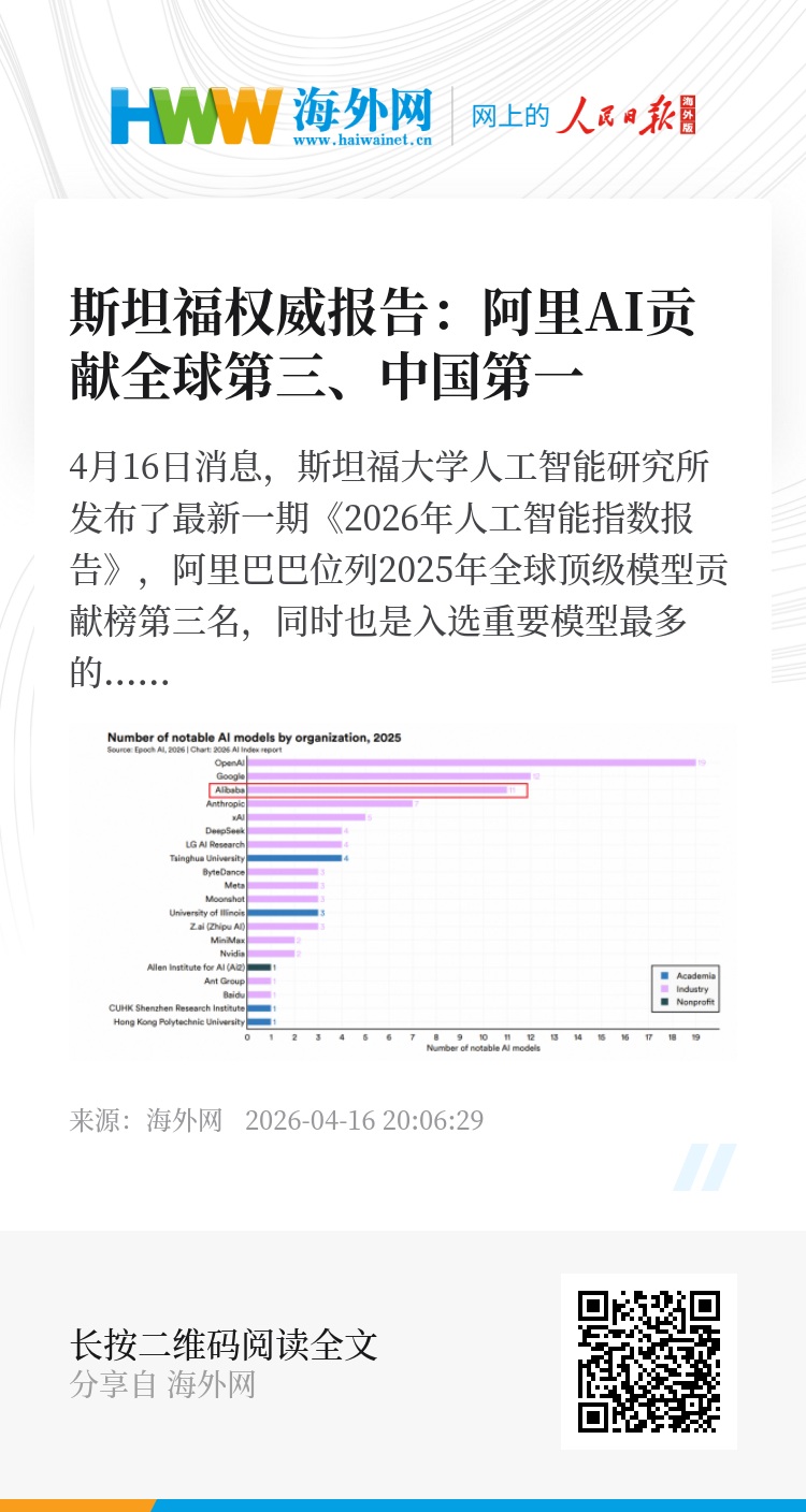 4月16日消息,斯坦福大学人工智能研究所发布了最新一期《2026年人工智能指数报告》,阿里巴巴位列2025年全球顶级模型贡献榜第三名,同时也是入选重要模型最多的中国科技公司。该报告指出,当前中美顶级大模型差距“实质性消除”,头部模型间表现相当,呈并跑态势。报告显示,在前20的AI机构中,中国11家超过美国位居首位。