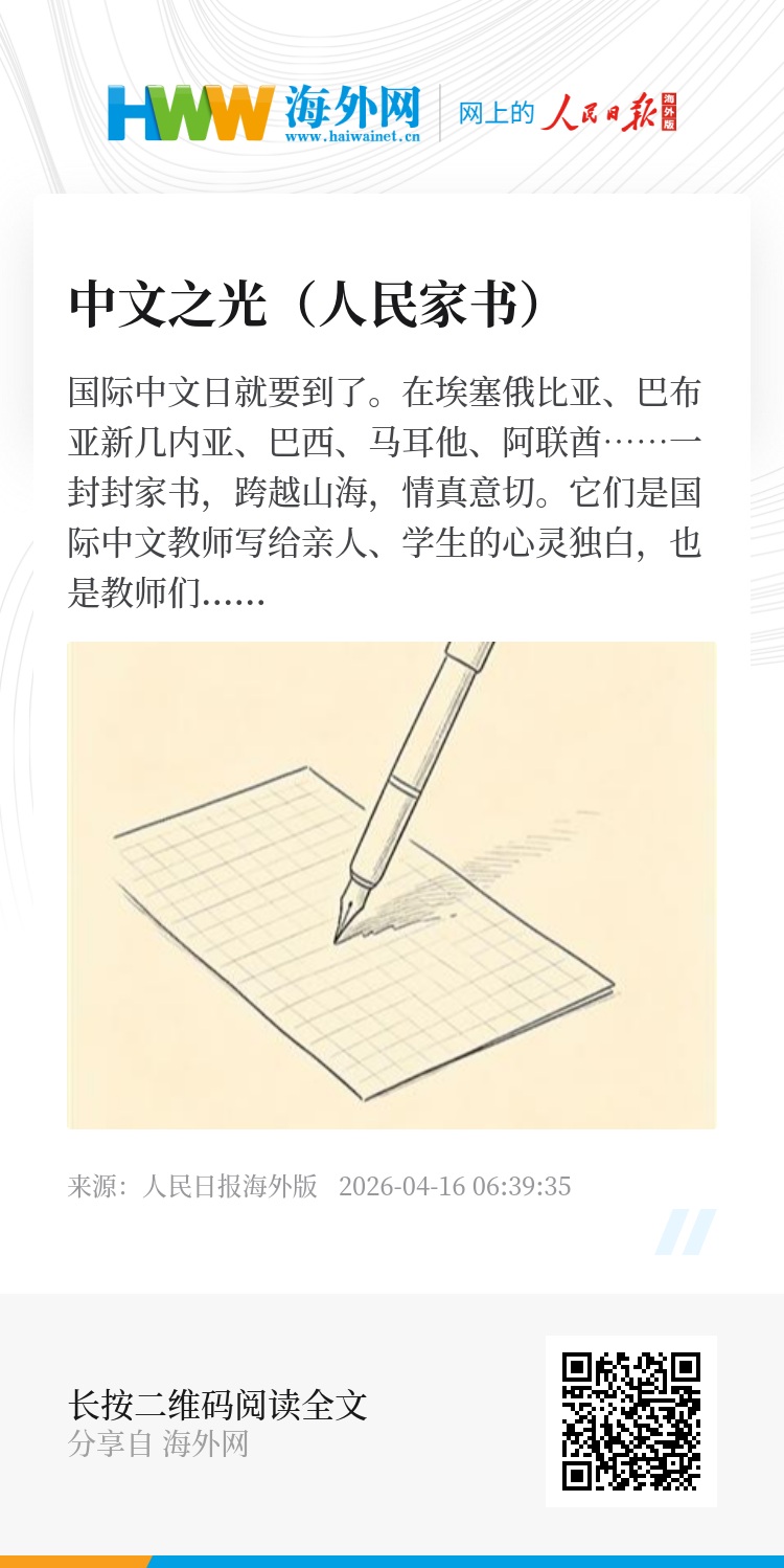一纸家书,道不尽牵挂与赤诚。这些在一线的国际中文教师,告别故土亲朋,奔赴五洲,以讲台为舟、以语言为桥,在异国他乡点亮中文之光,书写着国际中文教育的动人篇章。