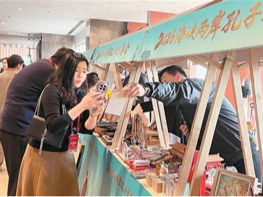 图为参访者在向文创市集的工作人员了解山东的文创产品。