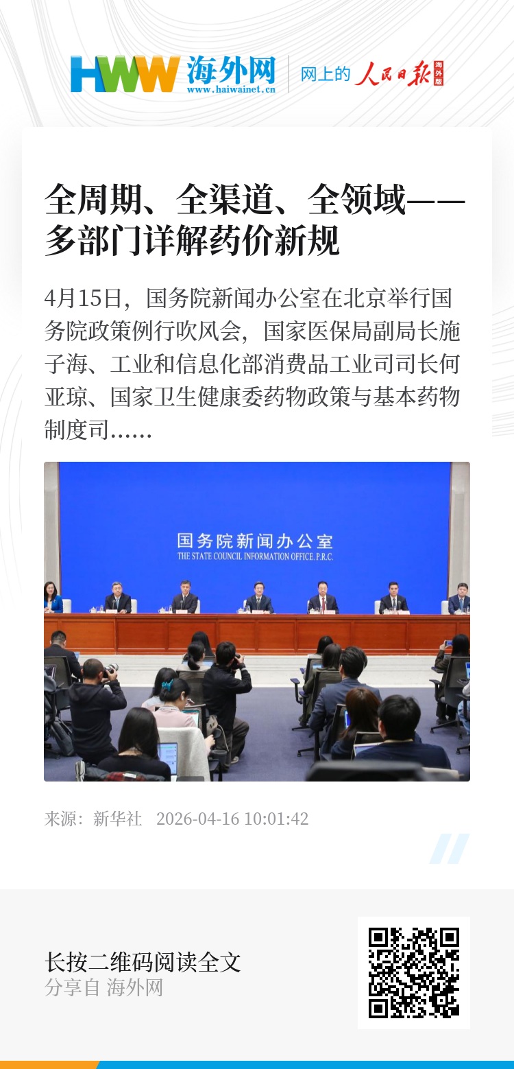 新华社北京4月15日电 题:全周期、全渠道、全领域——多部门详解药价新规