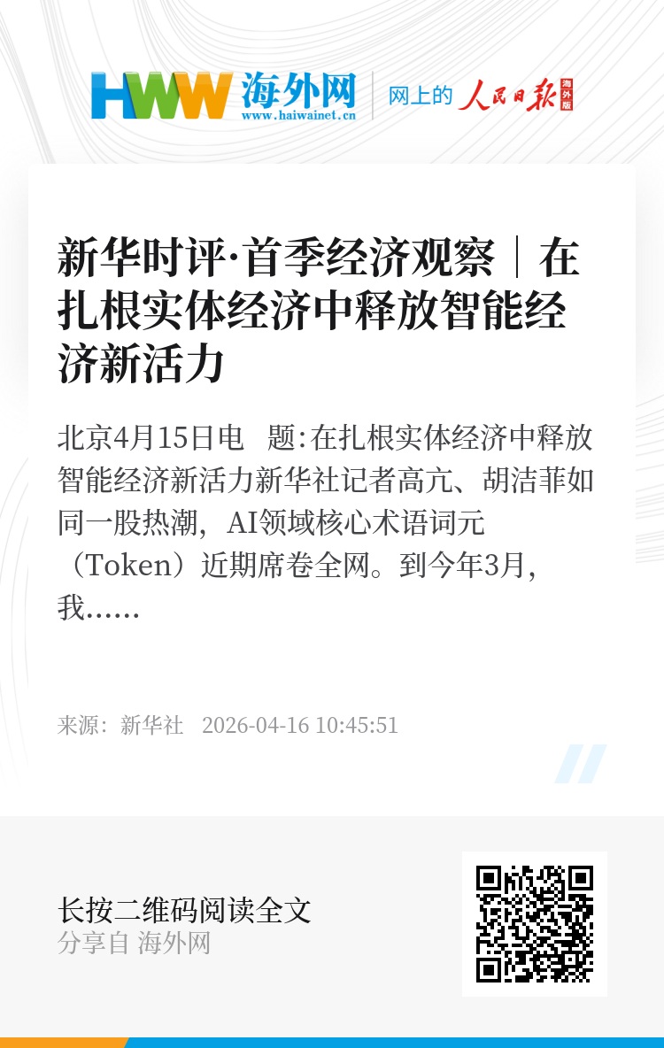 如同一股热潮,AI领域核心术语词元(Token)近期席卷全网。到今年3月,我国日均词元调用量已超过140万亿,较2025年底增长40%。这背后,是我国人工智能发展进入快速增长期;也进一步表明,扎根实体经济、回应民生需求,智能经济才能释放出新活力。