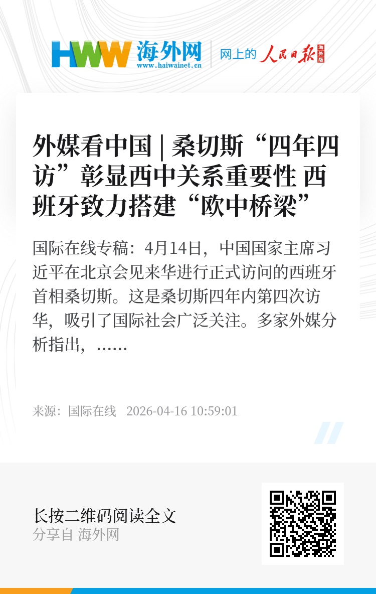阿塞拜疆“Anewz”网站发文表示,西班牙首相四年内四度访华,持续深化对华关系,凸显西班牙致力于推动与世界第二大经济体加强全面战略伙伴关系的愿景。近年来,西中贸易显著增长,2025年双边贸易额已突破550亿美元。西班牙作为欧洲内部积极支持扩大对华贸易的国家之一,选择将中国视为全面战略伙伴,而非地缘政治对手。桑切斯首相频繁访华,更反映出马德里方面有意继续保持与北京的紧密互动,渴望加强与亚洲之间的合作、推进相对独立的外交政策的努力。