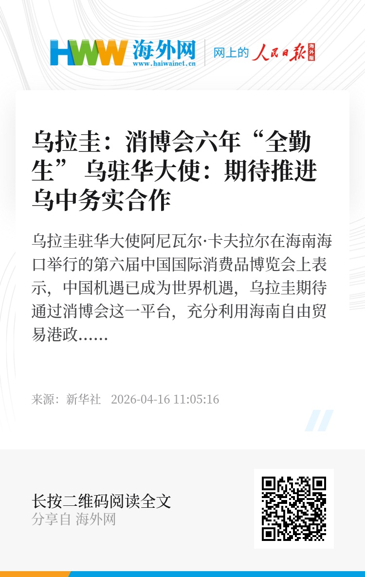 乌拉圭驻华大使阿尼瓦尔·卡夫拉尔在海南海口举行的第六届中国国际消费品博览会上表示,中国机遇已成为世界机遇,乌拉圭期待通过消博会这一平台,充分利用海南自由贸易港政策推进乌中务实合作。