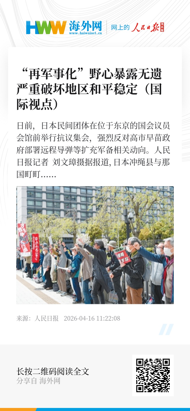 据报道,日本冲绳县与那国町町长13日与日本防卫大臣小泉进次郎会面,表示同意防卫省在与那国町部署防空导弹部队的计划。不久前,日本海上自卫队完成成立以来最大规模改组,水面作战部队定位由“护卫”转向“作战”;陆上自卫队在熊本县和静冈县部署多型远程导弹,并计划进一步向全国多地延伸部署;航空自卫队则将负责“太空监视”的“宇宙作战群”升级为“宇宙作战团”,大幅扩充人员规模……分析认为,高市早苗政府正加速推动武装力量向“进攻化”转型,持续架空日本宪法第九条,彻底背离“专守防卫”原则,“再军事化”野心暴露无遗。这些危险动向,引发了日本国内民众和有识之士的高度警惕与强烈反对。