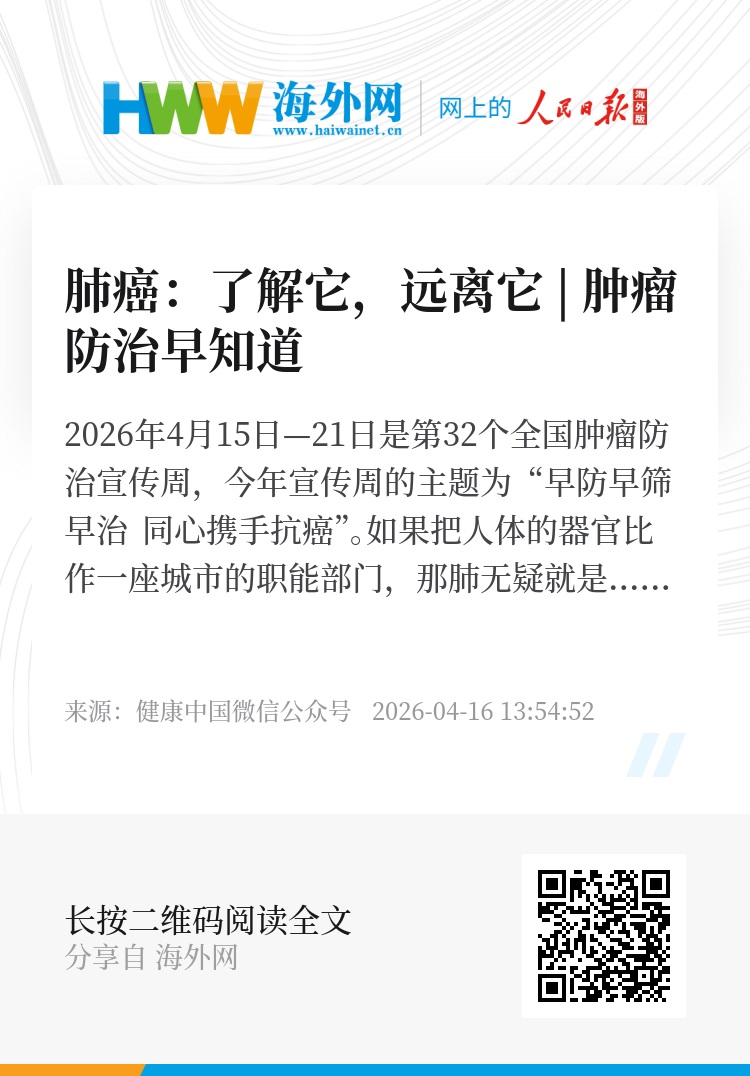 2026年4月15日—21日是第32个全国肿瘤防治宣传周,今年宣传周的主题为“早防早筛早治 同心携手抗癌”。
