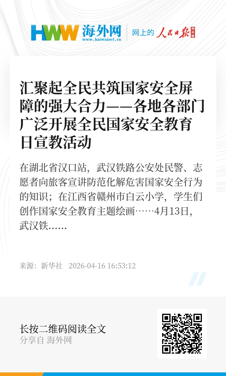 共青团中央、国家安全部启动“国家安全 青春挺膺”主题团日活动周;司法部、全国普法办部署开展2026年全民国家安全教育日普法宣传活动;中华全国总工会组织开展全国工会国家安全主题宣讲活动……中央和国家机关示范带动各地区、各部门学习宣传总体国家安全观,汇聚起全民共筑国家安全屏障的强大合力。
