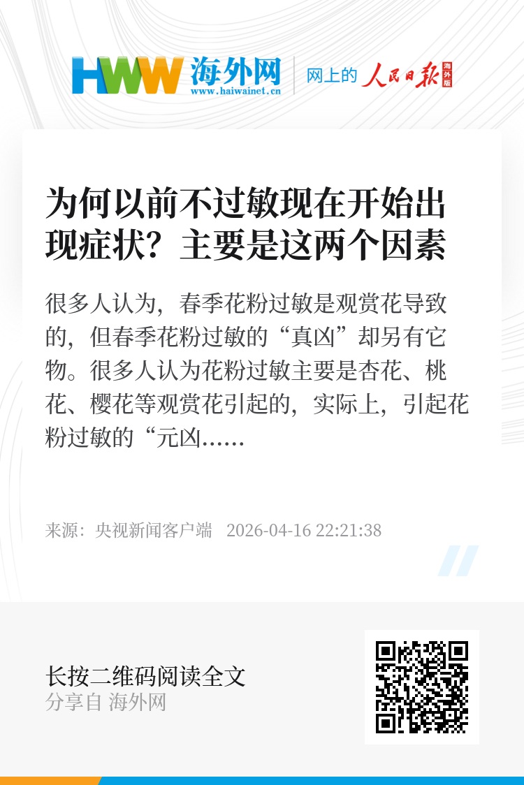 第一,花粉暴露量增加。目前全球气候变暖,花期延长,致敏植被分布广泛,致使空气中的花粉暴露量持续提升。花粉长期累积超出人体免疫耐受阈值,从而诱发相应症状。 第二,目前很多人的免疫状态是失衡的,长期压力大、熬夜、感冒、劳累等都可以诱发免疫失衡,从而让人体对花粉产生过度免疫反应。