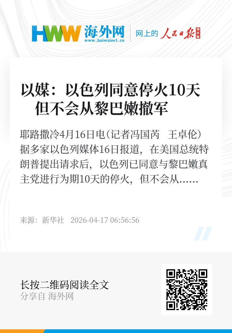 新华社耶路撒冷4月16日电(记者冯国芮 王卓伦)据多家以色列媒体16日报道,在美国总统特朗普提出请求后,以色列已同意与黎巴嫩真主党进行为期10天的停火,但不会从黎巴嫩南部撤军。