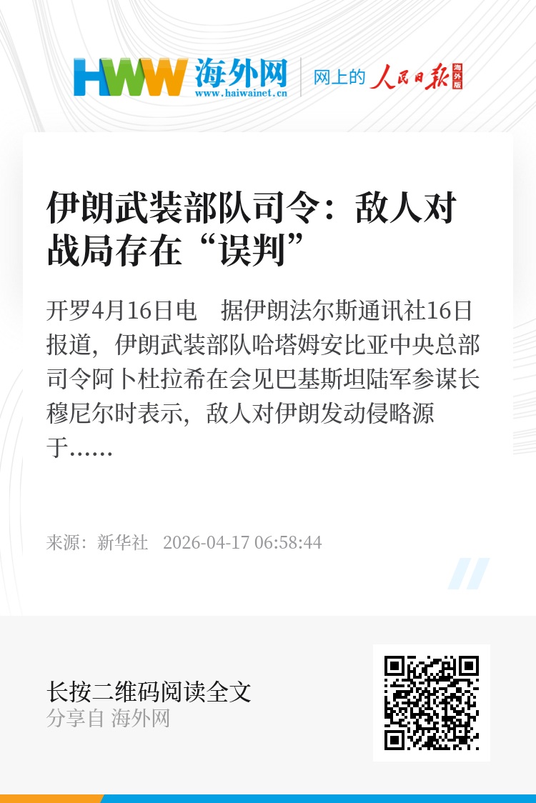 新华社开罗4月16日电 据伊朗法尔斯通讯社16日报道,伊朗武装部队哈塔姆安比亚中央总部司令阿卜杜拉希在会见巴基斯坦陆军参谋长穆尼尔时表示,敌人对伊朗发动侵略源于其对伊朗人民抵抗意志以及伊朗武装部队防御能力的“误判”。