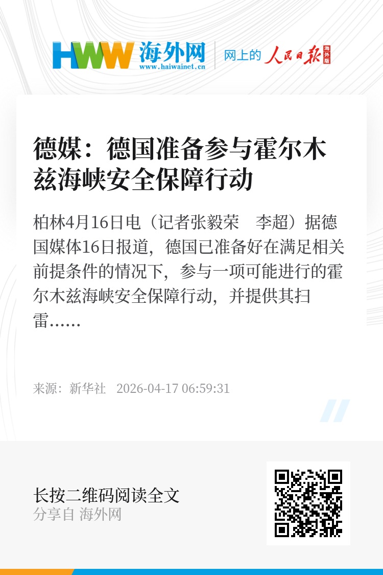 新华社柏林4月16日电(记者张毅荣 李超)据德国媒体16日报道,德国已准备好在满足相关前提条件的情况下,参与一项可能进行的霍尔木兹海峡安全保障行动,并提供其扫雷和海上侦察方面的能力。