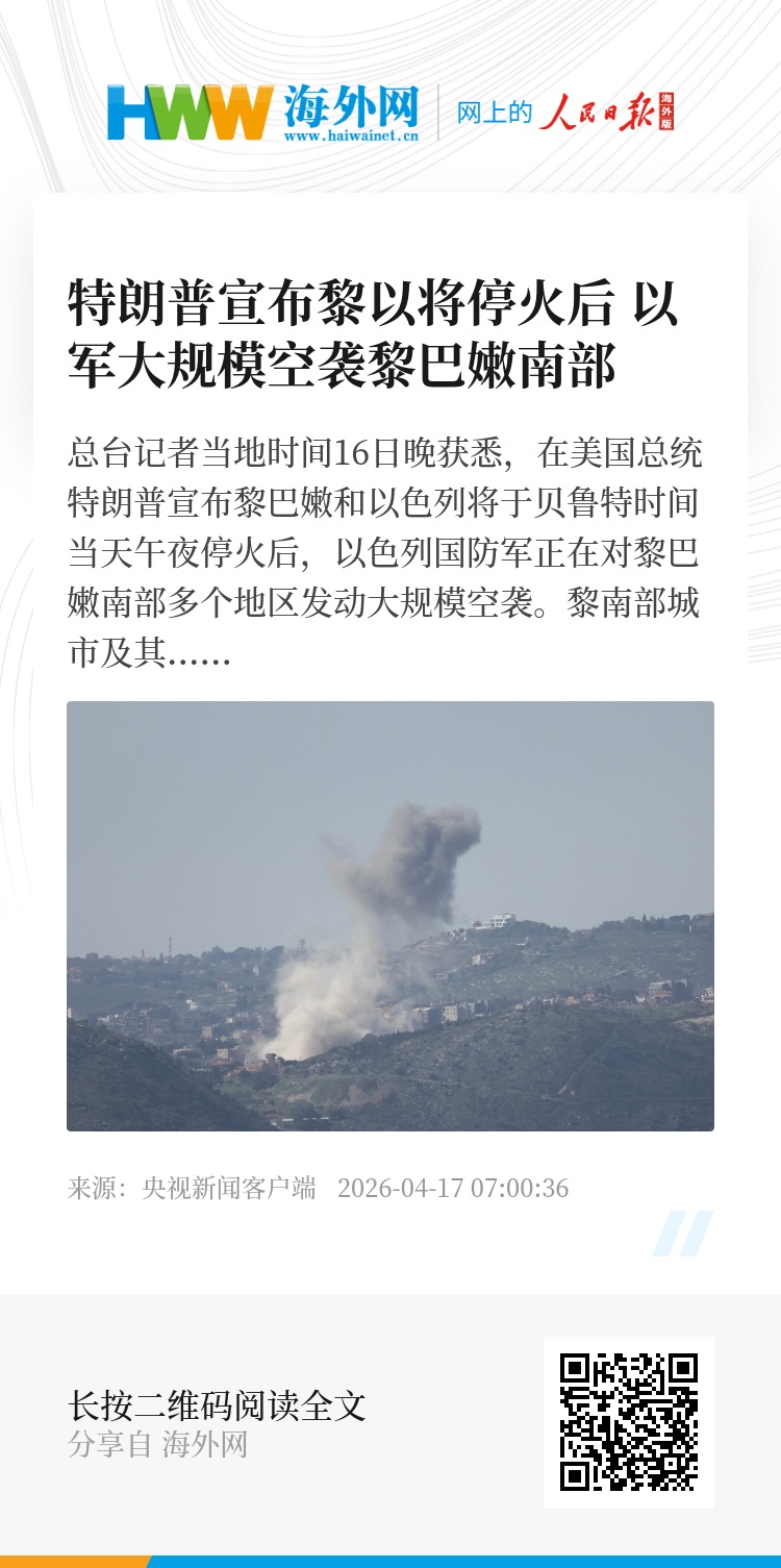 总台记者当地时间16日晚获悉,在美国总统特朗普宣布黎巴嫩和以色列将于贝鲁特时间当天午夜停火后,以色列国防军正在对黎巴嫩南部多个地区发动大规模空袭。