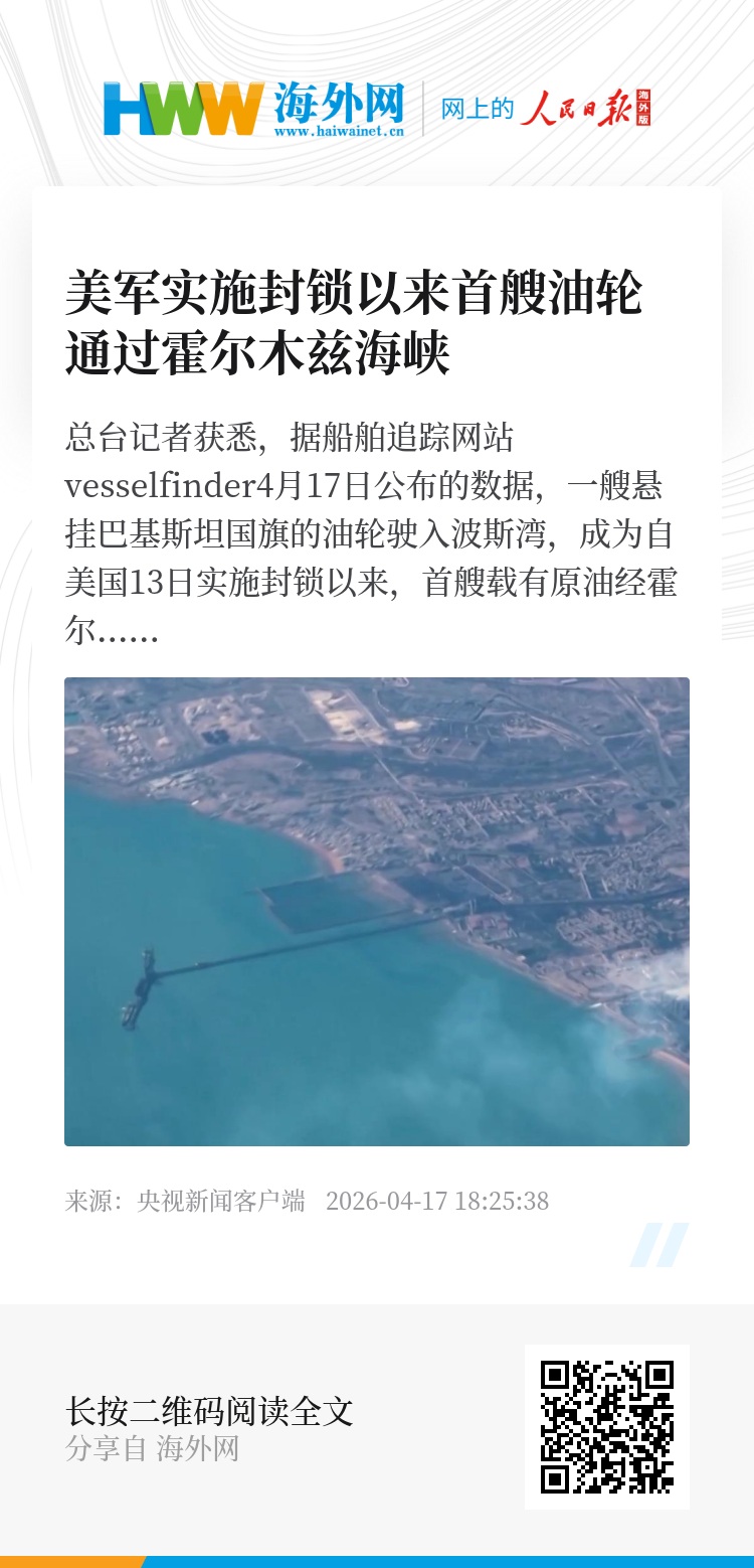 总台记者获悉,据船舶追踪网站vesselfinder4月17日公布的数据,一艘悬挂巴基斯坦国旗的油轮驶入波斯湾,成为自美国13日实施封锁以来,首艘载有原油经霍尔木兹海峡驶出的油轮。