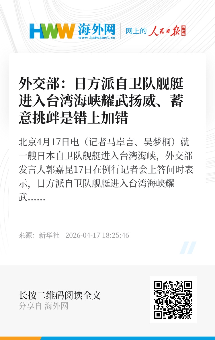新华社北京4月17日电(记者马卓言、吴梦桐)就一艘日本自卫队舰艇进入台湾海峡,外交部发言人郭嘉昆17日在例行记者会上答问时表示,日方派自卫队舰艇进入台湾海峡耀武扬威、蓄意挑衅,是错上加错,再次暴露日方一些人企图武力介入台海、破坏台海和平稳定的危险图谋。