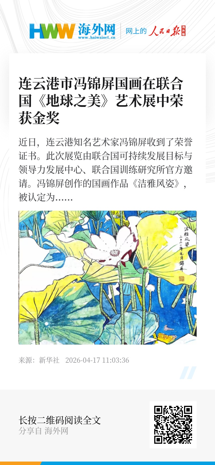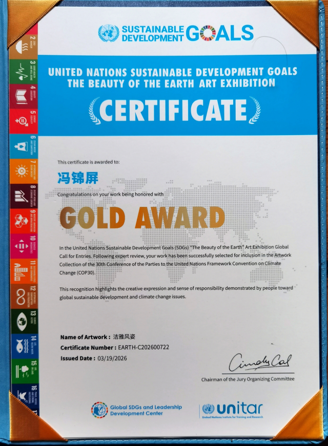 近日,连云港知名艺术家冯锦屏收到了荣誉证书。此次展览由联合国可持续发展目标与领导力发展中心、联合国训练研究所官方邀请。