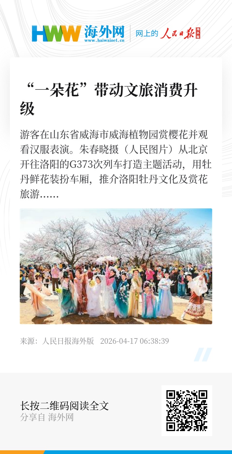 今年春季,多地围绕赏花活动同步优化交通接驳和文旅场景。洛阳在牡丹文化节期间,强化节会活动与城市消费联动,打造沉浸式文旅新场景;长沙推出“地铁+公交”春游专线,直达赏樱点和热门打卡地;北京依托市郊铁路S2线“开往春天的列车”,把花海景观、长城游览和周边休闲资源串联起来。游客进得来、游得顺、留得下,既提升了赏花便利度和参与感,也带动了沿线餐饮、文创、休闲等消费增长。