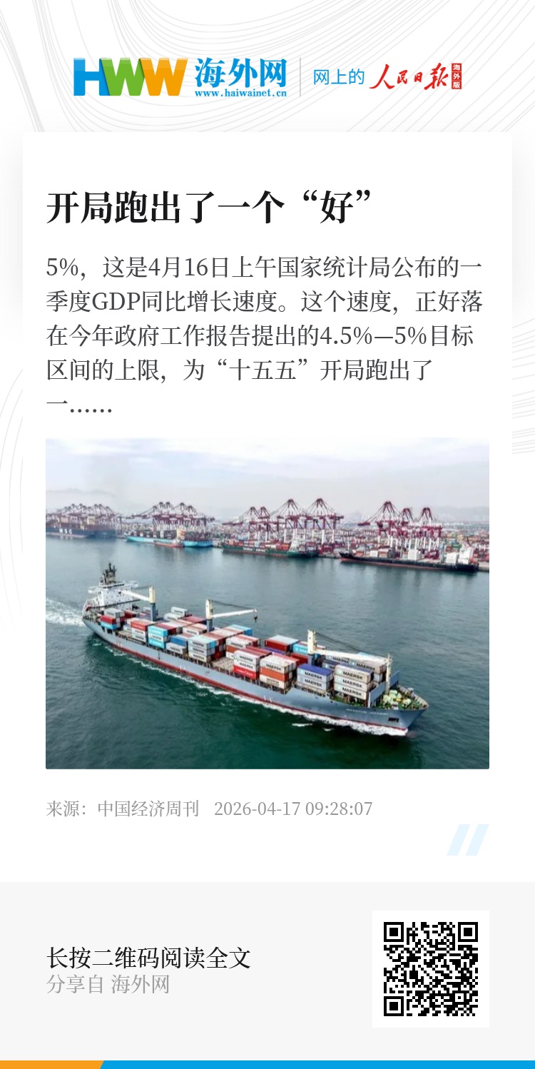 5%,这是4月16日上午国家统计局公布的一季度GDP同比增长速度。这个速度,正好落在今年政府工作报告提出的4.5%—5%目标区间的上限,为“十五五”开局跑出了一个好成绩,也为全年目标打下了不错的基础。
