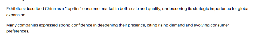 文章称,许多参展商将中国描述为兼具规模与品质的“顶级”消费市场,并强调了中国对于打开全球市场的重要性。许多企业表示,鉴于不断增长的需求和持续更新的消费者偏好,他们对深耕中国市场充满信心。