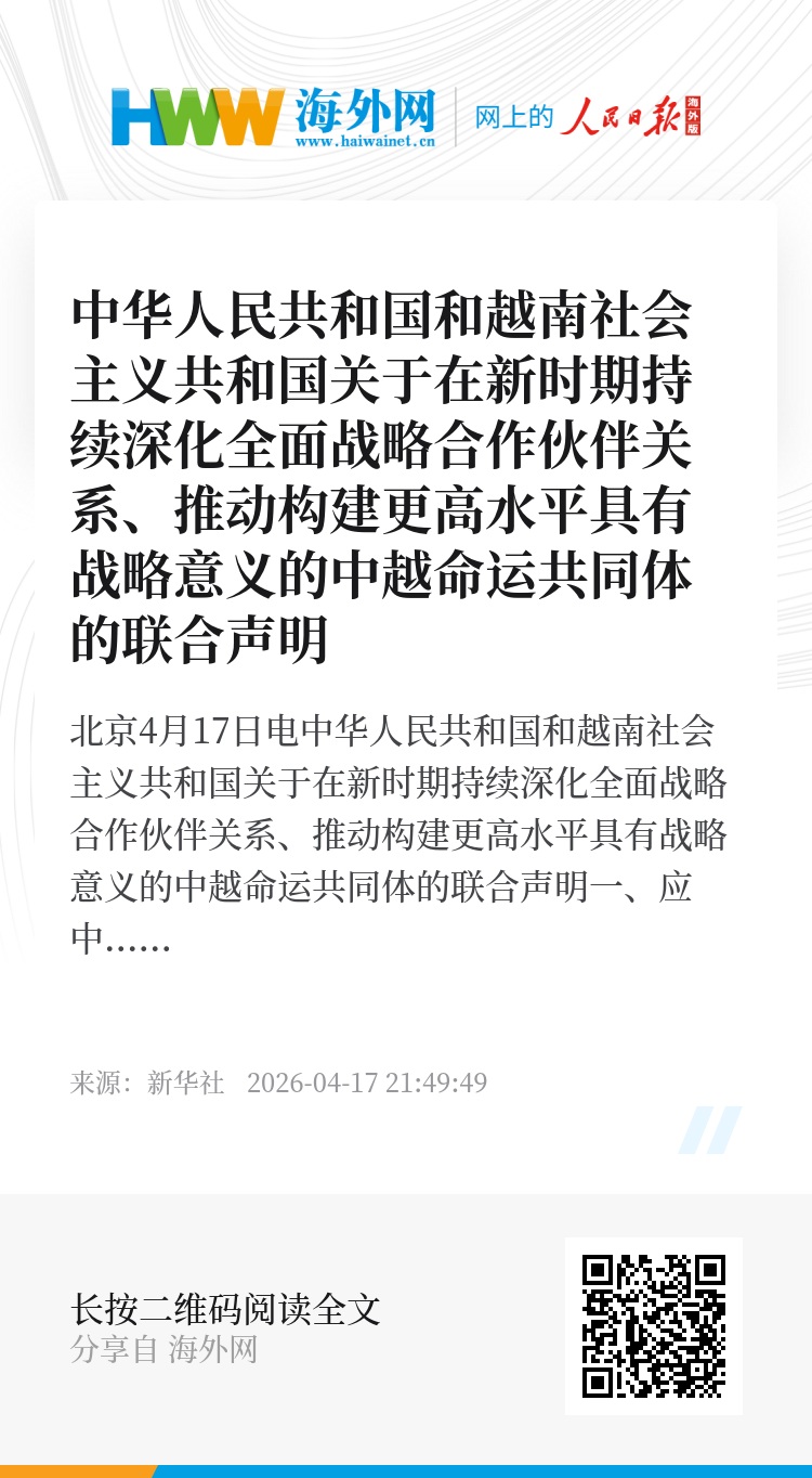 一、应中国共产党中央委员会总书记、中华人民共和国主席习近平邀请,越南共产党中央委员会总书记、越南社会主义共和国主席苏林于2026年4月14日至17日对中华人民共和国进行国事访问。