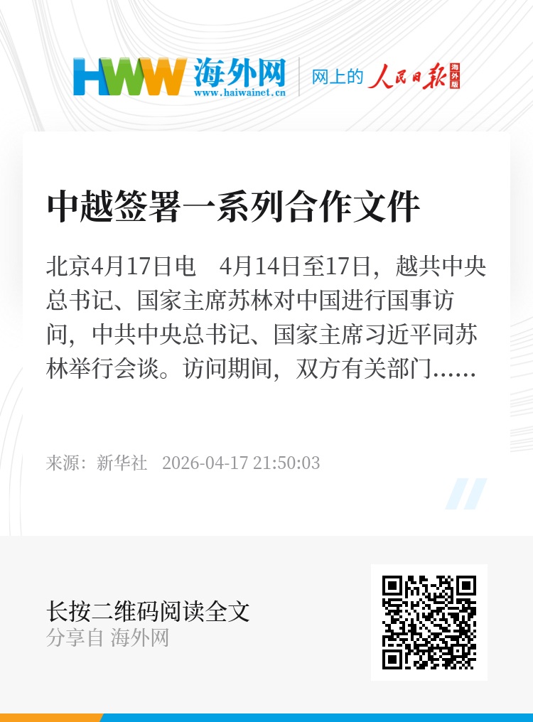 新华社北京4月17日电 4月14日至17日,越共中央总书记、国家主席苏林对中国进行国事访问,中共中央总书记、国家主席习近平同苏林举行会谈。访问期间,双方有关部门和地方签署了以下合作文件:
