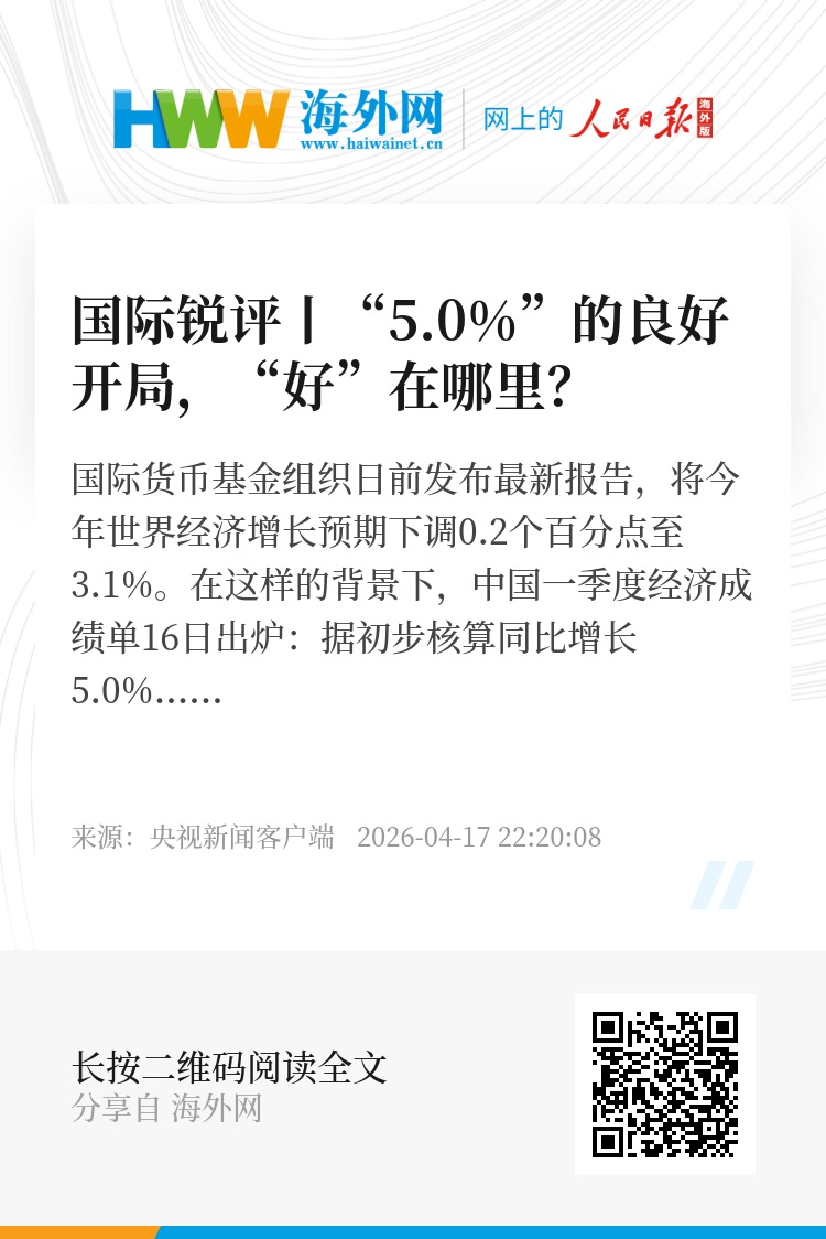 中国好,世界会更好。这个春天,从跨国高管密集访华,到国际资本加仓中国,再到经济首季报超出预期,中国的表现令世界瞩目。IMF总裁格奥尔基耶娃评价说,当全球面临多重挑战,中国经济仍具韧性、潜力巨大,将对世界产生积极影响。“5.0%”的增长,不只是一季度的亮眼成绩,更是“十五五”实现良好开局、与世界共享机遇的清晰信号。