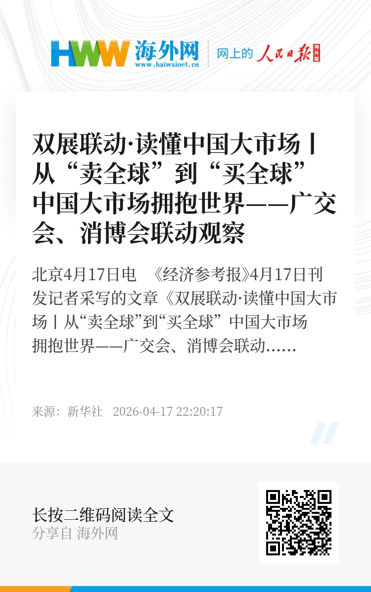 新华社北京4月17日电 《经济参考报》4月17日刊发记者采写的文章《双展联动·读懂中国大市场丨从“卖全球”到“买全球” 中国大市场拥抱世界——广交会、消博会联动观察》。文章称,四月的中国,两场重磅展会如约而至:珠江之畔,第139届中国进出口商品交易会(广交会)如期绽放;南海之滨,第六届中国国际消费品博览会(消博会)正在海南举办。一个是中国历史最悠久的“第一展”,展览总面积、展位总数、参展企业数均超往届;一个是“十五五”开局之年我国重大展会的“首展”,也是海南自贸港全岛封关运作以后的“首秀”。