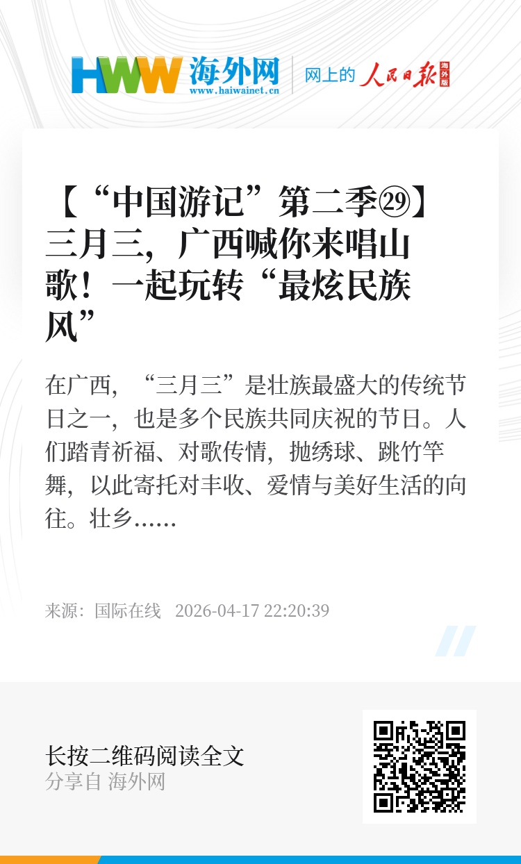 在广西,“三月三”是壮族最盛大的传统节日之一,也是多个民族共同庆祝的节日。人们踏青祈福、对歌传情,抛绣球、跳竹竿舞,以此寄托对丰收、爱情与美好生活的向往。