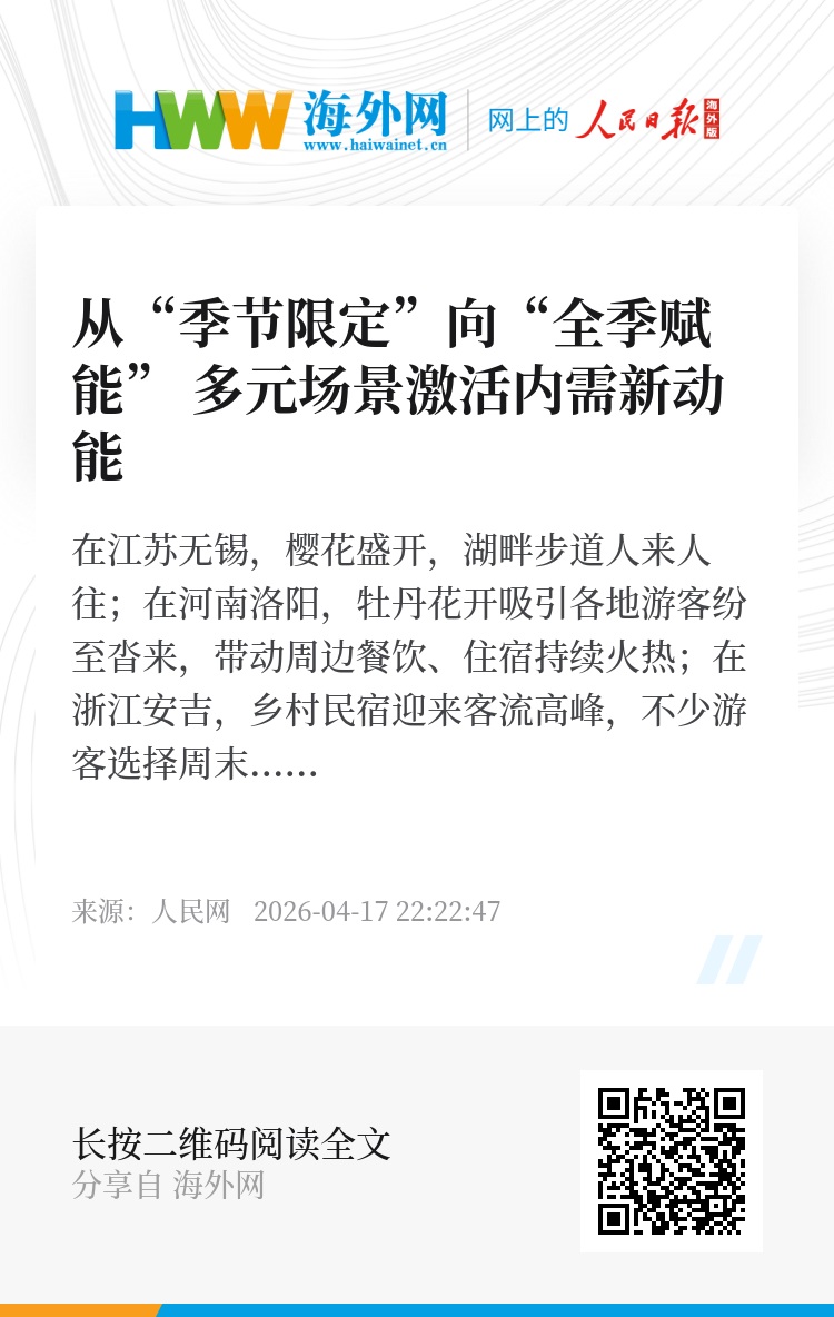 叶胥认为,应在产业培育上提前布局、统筹规划。一方面要依托春景、春茶等特色资源,开发沉浸式体验和季节性产品,延长消费链条;另一方面也要前瞻布局跨季节产品和场景,实现由春及夏的消费衔接。同时,通过冷链物流和加工技术提升季节性产品的“保鲜能力”,拓展销售周期和市场空间,推动春日消费向常态化、持续化转变。(人民网记者 王绍绍 实习生祝铭旋对本文亦有贡献)
