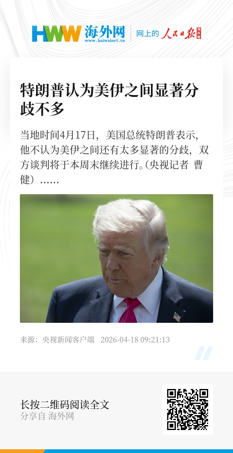 当地时间4月17日,美国总统特朗普表示,他不认为美伊之间还有太多显著的分歧,双方谈判将于本周末继续进行。(央视记者 曹健)