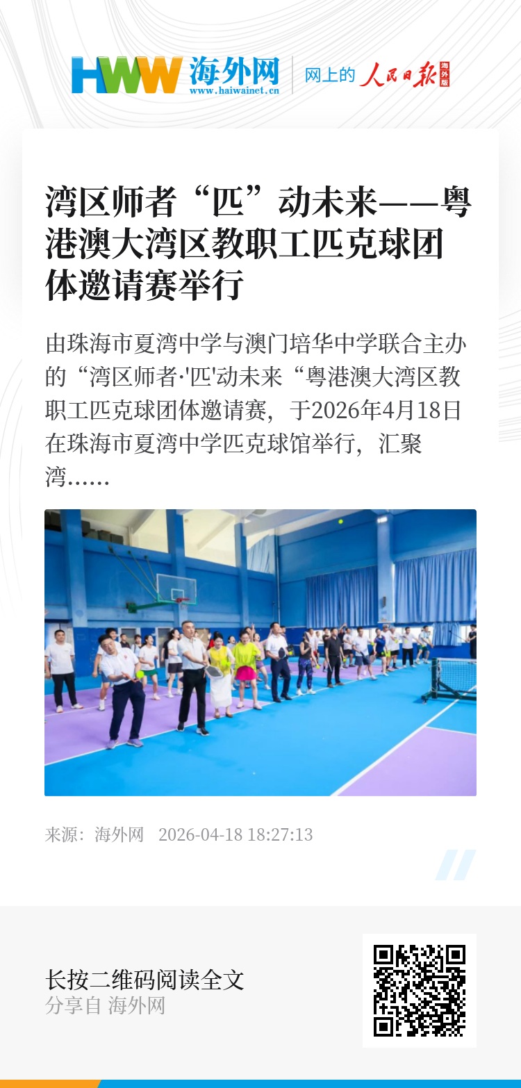 由珠海市夏湾中学与澳门培华中学联合主办的“湾区师者·'匹'动未来“粤港澳大湾区教职工匹克球团体邀请赛,于2026年4月18日在珠海市夏湾中学匹克球馆举行,汇聚湾区十余所学校教职工同场竞技,藉此以球会友、以赛促融,共促教育交流与体育文化融合。