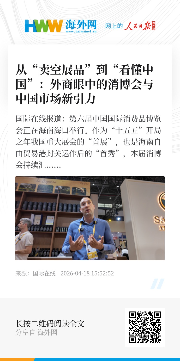 国际在线报道:第六届中国国际消费品博览会正在海南海口举行。作为“十五五”开局之年我国重大展会的“首展”,也是海南自由贸易港封关运作后的“首秀”,本届消博会持续汇聚全球优质商品,吸引了众多境外企业和采购商参展参会。多位来自欧洲、非洲及中东地区的企业代表在接受国际在线记者采访时表示,中国超大规模市场优势不断显现,科技创新与消费升级同步推进,开放合作持续深化,为全球企业提供了广阔的发展空间。